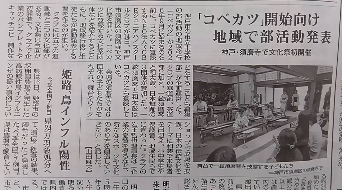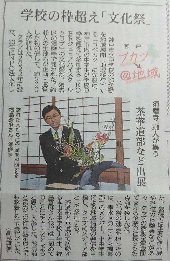活動報告 地域で行う、こども達主体の文化祭の取材に感謝❣ 『神戸新聞』『毎日新聞』 KOBE J.H.S.C 事務局 2025年12月20日 神戸市立中学校の部活動を地域展開(地域移行)に先駆け、神戸市内の中学生が学校の枠を超えて参加する「KOBEジュニアハイスクールクラブ」の文化祭が、須磨区の須磨寺で開かれた。約40人の生徒が企画・運営した初の催しで、約300人が訪れた。(神戸新聞)